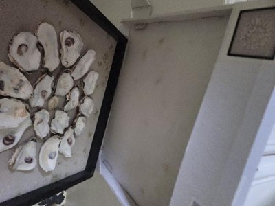 I received that package timely. It was packaged to perfection. Bubble wrapped very well to ensure no damage to frame or oysters. Once I got the package unwrapped, I noticed the fabric was stained at the bottom of the art piece. I didn't understand because it was spotted. I thought maybe the oysters were wet when applied, but there were no run, just spots. I turn the frame over, and OMG!!! No exaggeration. The entire back is covered in mold spurs. Upset is beyond word. I touched this thing, opened it in my house. I quickly took it out to the garage with the box and wrappings. I dont know how to return this, but I wouldn't even want to. This is not going in my car or back to the store. I pray I don't get sick from this and wouldn't want anyone else to handle this hazard. It needs to go in the garbage. The piece is nice and that's why I purchased with one in the cart if I liked what I received. Please look into what cause this. I will pay attention to my health wise from contact.