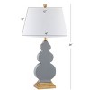 This beautiful tapered triple gourd base ceramic table lamp will brighten up your home with the elegance of contemporary style. Modernized from the midcentury classic by a revised shape that is flat on two sides but retains the classic curves of the original, the look is completed by a gold leaf stepped pedestal base. Finished in a glossy gray glaze, it is topped with a slightly tapered cotton linen drum shade and gold finial.