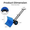 This heavy-duty rolling snow pusher combines power with practicality. The oversized 29x20 inch blade adjusts to five different angles for versatile snow removal. The telescopic handle adjusts to multiple heights while the ergonomic T-grip ensures comfortable use. Built with powder-coated steel and reversible wear strips, it's designed for long-term durability. The anti-skid wheels ensure stable movement across various surfaces. Easy to assemble and store vertically, it's the perfect solution for residential and commercial snow removal needs. Specifications: Blade Size: 29" x 20" Handle: Telescopic 2-gear system Wheels: Dual 9.84" anti-skid tires Construction: Powder-Coated Steel Features: Reversible Wear Strip, Angle Adjustment