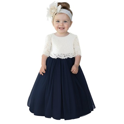 2Bunnies Girls' 12M-12yr Boho Rustic Garden Lace Sleeve Flower Girl Dress Navy 12 months