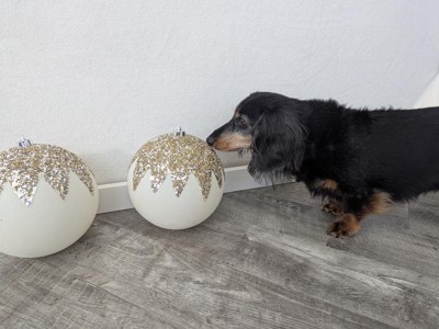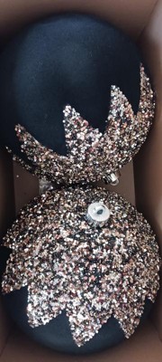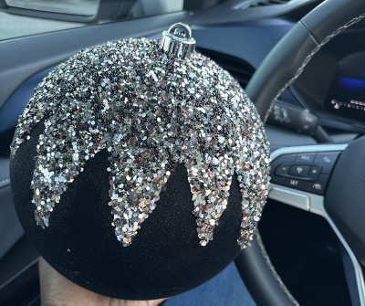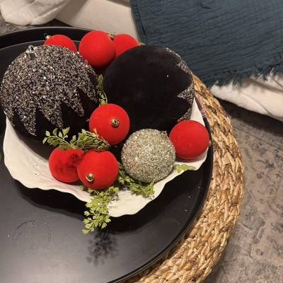 Love the size of the ornament. Definitely large enough to fill in those big gaps in a tree. I didn’t see the black one in person but saw the white one. I was a little shocked to notice the black has gold silver and a hint of pink glitter in it. Nevertheless I’m keeping them since you won’t be able to tell on my tree. My only issue is that I order 4 packs of them and a few had red felt on it. It was very slight but I’m not sure where that came from. I’ll just make sure that side is tucked away in the tree.