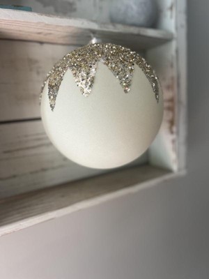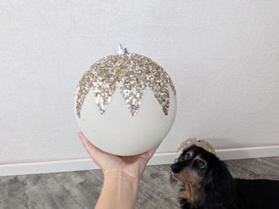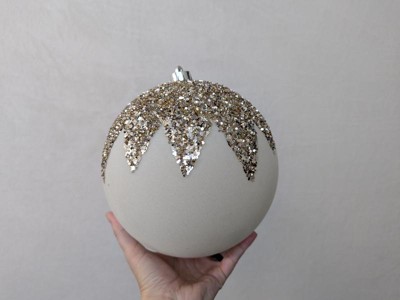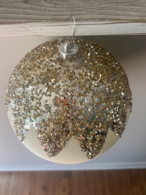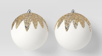 Add festive sparkle to your Christmas tree with this 2-Count 200MM Flocking Ball with Handgraft Chunky Glitter Ornament Set from Wondershop™. This plastic ornament set features two white flocked ball ornaments, topped with chunky gold glitter for a shimmery effect. These ornaments are sure to add a festive touch to your tree, featuring built-in top loops for easy display.