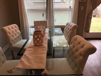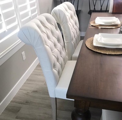 A: WARNING:This product can expose you to chemicals including Di(2-ethylhexyl) phthalate (DEHP), which are known to the State of California to cause cancer and birth defects or other reproductive harm. For more information go to www.P65Warnings.ca.gov. www.p65warnings.ca.gov Description With an elegantly rolled top, the Christopher Knight Home Dinah Tufted Fabric Dining Chair Set with roll top (set of 2) is a beautiful addition that will add luxury to your dining space. These chairs feature linen blend upholstery, with a tufted backrest and complementary weathered wood legs. Their versatile design allows you to place them in your dining room or as an accent chair in your living room or be