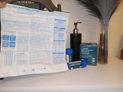 Weeks 1 to 6 Weeks 7 to 9 Weeks 10 to 12 1 lozenge every 1 lozenge every 1 lozenge every 1 to 2 hours 2 to 4 hours 4 to 8 hours, Directions if you are under 18 years of age, ask a doctor before use. No studies have been done to show if this product will work for you. before using this product, read the enclosed User's Guide for complete directions and other important information begin using the lozenge on your quit day if you smoke your first cigarette within 30 minutes of waking up, use 4 mg nicotine lozenge if you smoke your first cigarette more than 30 minutes after waking up, use 2 mg nicotine lozenge according to the following 12 week schedule:, nicotine lozenge is a medicine and must be used a certain way to get the best results place the lozenge in your mouth and allow the lozenge to slowly dissolve. Minimize swallowing. Do not chew or swallow lozenge. you may feel a warm or tingling sensation occasionally move the lozenge from one side of your mouth to the other until completely dissolved do not eat or drink 15 minutes before using or while the lozenge is in your mouth to improve your chances of quitting, use at least 9 lozenges per day for the first 6 weeks do not use more than one lozenge at a time or continuously use one lozenge after another since this may cause you hiccups, heartburn, nausea or other side effects do not use more than 5 lozenges in 6 hours. Do not use more than 20 lozenges per day. it is important to complete treatment. If you feel you need to use the lozenge for a longer period to keep from smoking, talk to your health care provider.Other information