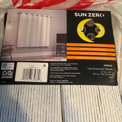 Featuring a unique vertical strie design, Sun Zero Halleck Curtain Panel Pairs adds intrigue and depth to any living space. Equipped with grommets for easy hanging on standard curtain rods up to 1.5" in diameter. Sun Zero Total Blackout Thermal Insulation is laboratory tested to block out 100% of light, reduce outside noise by up to 40%, and decrease energy lost through your windows by up to 40%. Comfort is optimized with thermal properties that help keep summer heat and winter chill out of your home. Hang in your entertainment room to eliminate screen glare and reduce distracting outside noise, or in your bedroom for enhanced privacy and a sounder, more uninterrupted sleep. Mount rods at least 2" above the window for maximum light blocking. Pair includes 2 slate blue panels, each measuring 37" width by 63" length. Measure carefully before selecting your desired size and quantity. Rod not included. Machine wash cold on gentle cycle. Use non-chlorine bleach when needed. Tumble dry on low heat, using a cool iron as needed.