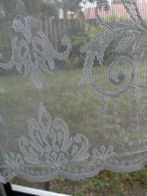 [This review was collected as part of a promotion.] It’s definitely pretty & very elegant. The material is very thin and see through. I’m more of a non- see through curtain type of gal. It’s small and would look well with a kitchen sink window. If I seen this in store I probably would not buy it. It’s thin so it’s not strong and it does get dirty easily.