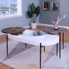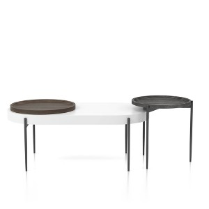 A striking centerpiece to any living room, this 2-piece occasional table set includes a modern coffee table and end table. With added versatility, the long coffee table features a round tray-like lazy Susan style that sits on top and offers rounded edges for a soft look. Each multi-tone furniture piece rests on thin metal legs and offer an open and airy bottom.