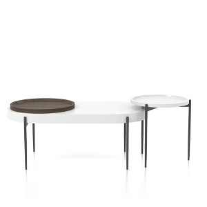 A striking centerpiece to any living room, this 2-piece occasional table set includes a modern coffee table and end table. With added versatility, the long coffee table features a round tray-like lazy Susan style that sits on top and offers rounded edges for a soft look. Each multi-tone furniture piece rests on thin metal legs and offer an open and airy bottom.