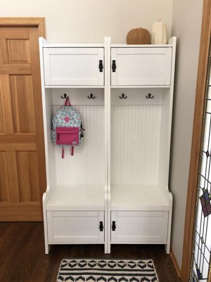 This is a gorgeous, functional piece for our entry. We have baskets in the lower cabinets and our kids already know to tuck their shoes in there when they get home. The hooks are perfect for their current jacket and bag. Lots of space on top for additional storage or decor. Couldn't be happier with this purchase.