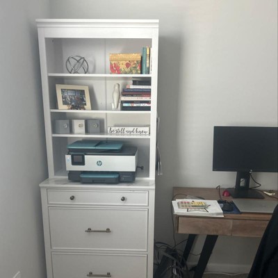 Create added storage space with the 2pc Harrington Modular Office Cabinet Set with Hutch by Lifestorey. Designed to offer flexible and multi-functional storage space for the home office. The top drawer is a convenient place for paper, pens, and notepads, while the two large lower drawers are ideal for storing books, binders, folders and more. The cabinet features a faux marble top with brass handles and knobs for an added level of sophistication. Hutch features three shelves with a fixed center shelf and two adjustable shelves. Constructed of MDF, in a white finish with a modern inspired farmhouse design.