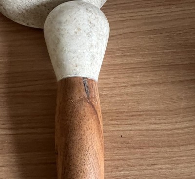 - White and gray mortar bowl with wood-top pestle