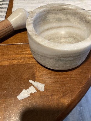 submitted byKatherine - 4 months agoA: Hello Lucy - Thank you for your interest on - 2pc Marble & Wood Mortar and Pestle Set Warm Gray. The Wood Mortar and Pestle Set is sturdy, the wood does not break away from the marble. Hope this helps. - Rose
