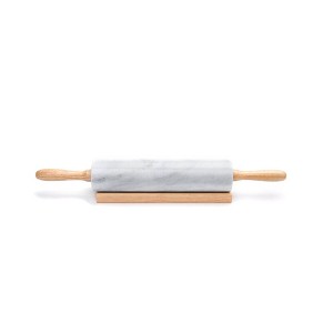 Enjoy baking cookies or rolling out your own pizza dough with the family? Then bring some ease to your baking with this White Marble Rolling Pin! The rolling pin is 10" long, has nylon ball bearings for a smooth rolling, wooden handles for easy grip, and a wooden base for rest. The marble helps keep the dough cool while rolling, and its natural non-stick properties keep dough from clinging. Even the toughest doughs are flattened easily and effortlessly. Let the smoothness and heft of this rolling pin do the hard work for you!