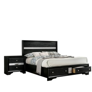 Attractive and alluring, this two-piece bed and nightstand set is just what you need to create a peaceful sleeping quarters. Finished in a stunning black color, the panel bed boasts an intricately beautiful headboard with a shimmery silver stripe. At the footboard you'll find two storage drawers, perfect for tucking away small blankets. The matching two-drawer nightstand shares the same shimmery accent with one hidden jeweler drawer.