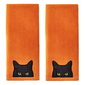 Add extra haunt to the Halloween season with this 2-piece hand towel set. Each towel is made of soft and absorbent terry velour, featuring embroidery of a black cat with starring eyes. Can be used in the bath or kitchen, and also makes a fun gift!