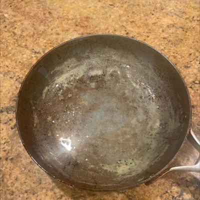 A: The exterior surface of the frying pans is made from 18/0 stainless steel.