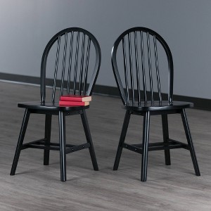 As early as the 16th century, English woodworkers began fashioning chair spindles in the same way they made wheel spokes, a design that became known as the Windsor Chair. This Winsome 2-piece set echoes that tradition. The 6-spindle arched back and the wide contoured seat offer the kind of support you want when lingering over dinner. The chairs are made of solid wood in a crisp black finish that will enliven your kitchen or dining area from contemporary to transitional decor. A double set of crossbars add durability and stability. Static weight capacity is 220 lbs. Conveniently ships in 1 box with all the hardware needed for assembly.