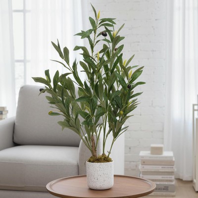 2pcs 2ft Artificial Olive Tree, Faux Trees Indoor with Planter, Fake Olive Tree with Natural Wood Trunks, Realistic Leaves and Fruits for Home Office