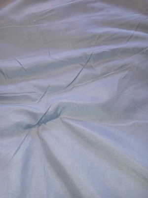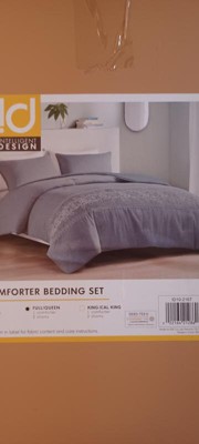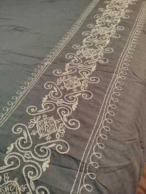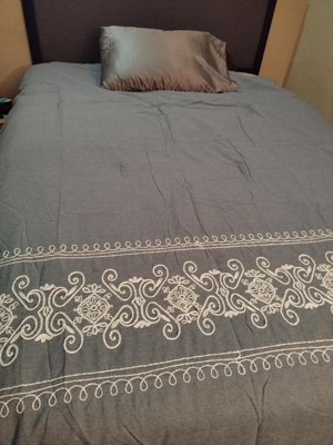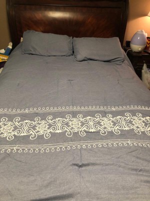 [This review was collected as part of a promotion.] This is a really pretty comforter. It is a little more blue-grey toned than I thought (versus more straight blue), but it still looks very nice. Since it was a Full/Queen size, I was worried it would be too small for our Queen bed; however, it had plenty of width to cover the bed and hang over the sides. I like the white detail on the bottom of the comforter; it really adds a romantic touch to the comforter. I do wish the 2 shams would also include some of that detail to tie it all together and make the shams stand out a bit more. The top of the comforter is pretty soft, but the bottom is really soft and smooth and feels nice against the skin. The comforter is a good weight for me, as it provides some warmth but it isn't too hot.