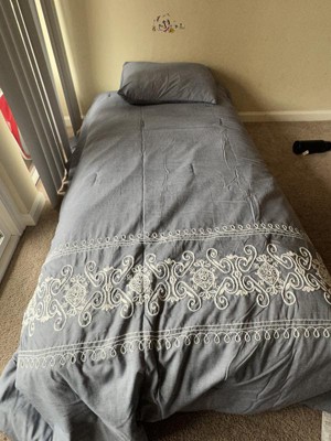 Bring a dreamy and romantic allure to your bedroom with the Intelligent Design Bree Embroidered Comforter Set. This lovely blue comforter features beautiful white embroidery details at the foot of the bed that add an elegant touch of beauty. Matching shams (1 in Twin/TwinXL) complement the comforter and complete the casual look of the comforter set. The hypoallergenic polyester filling in the contemporary comforter contains no allergens and is treated to be dustproof. Machine washable for easy care, this comforter set has an antimicrobial treatment that helps reduce the growth of odor causing bacteria and keeps fabric lasting longer. Items may come in rolled or compressed packing and will need to be fluffed up. Use a steam iron to help remove wrinkles easier.