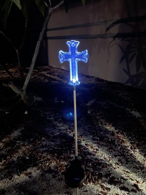 [This review was collected as part of a promotion.] Very pretty solar pathway lights. They come in a set of 2 clear crosses. I placed them outside and turned the switch to auto. After soaking up the sun all day the solar was ready. They automatically turned on when it got dark. I took a photo of what it looks like illuminated. It’s very pretty and subtle. Great addition to the outside area I have placed them in.