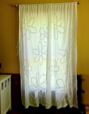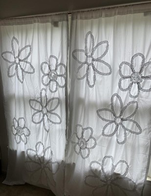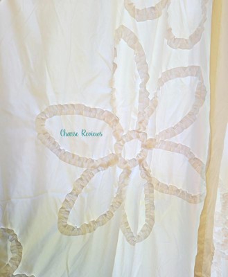 [This review was collected as part of a promotion.] The White Ruffle Flower Curtain panels are cute and come in a crisp white color. They measure out to 42 x 84 inches total. These fit perfectly on our windows and helped to filter out some sunlight but not completely block it. It also did help to cool down the room so it did not get as warm in that room as it did before we hung up the curtains. While they are cute and I like the white color I almost wish the flowers were another color as they just blend in being white on white and at quick glance they just look wrinkly. So, the flowers are not completely noticeable until you actually look at them due to no coloring difference. Maybe having the Ruffle Flowers in a light grey or a beige to keep it neutral, even an off white maybe. If you want something brighter, maybe offer the Ruffle Flowers in colors. While I do like these curtains a lot and they go great in the room I hung them in I do think they could make a better first impression than they currently do - a very wrinkly pair of curtains that could use an iron badly! Overall, I would recommend these Ruffle Flower Curtains to some as this is more their taste than others. I received this product for free in exchange for my honest opinion.