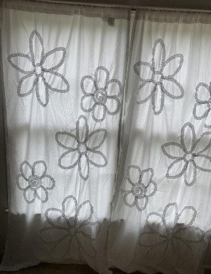 Big beautiful, embroidered ruffles in the shape of flowers make this window curtain set both elegant and fun. It's perfect for any age and brightens any room. This curtain set adds texture to your home and is perfect for minimalist or parisian chic designs. These curtains can change the whole look of your space without overwhelming it. Fancy, frilly and unique are all words that describe this window panel set. With such a beautiful and romantic design, this panel set offers incredible value and flexibility. This style is sold by the pair, so you will get two panels with each set. Each single panel measures 42 inches wide by 84 inches long. It hangs easily with a three-inch rod pocket. This window curtain set is STANDARD 100 by OEKO-TEX certified. Please refer to the care instructions label for full instructions before cleaning.