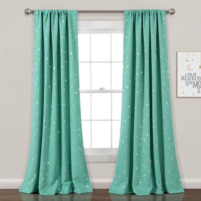 Decorate your child's windows with the playful Lush Decor Star Blackout Curtains. These blue curtains are sprinkled with a pattern of small metallic silver stars that create a magical, dreamlike atmosphere for your kids bedroom. These 100% blackout curtains for bedroom provide maximum privacy and are energy efficient: blocking out sunlight, reducing noise, and regulating room temperature. Add these curtains to your nursery, playroom, or kids bedroom decor. These star curtains are crafted from a soft microfiber fabric with a white polyester lining. Sold as 2 panels, each measuring 52 inches wide in multiple length options. These drapes offer seamless installation with a 3" rod pocket, allowing you to easily slide it onto your curtain rod or using clip rings (not included). Caring for these nursery curtains are easy, simply machine wash cold on the gentle cycle and tumble dry low. Do not iron. Use a steamer to release wrinkles, if needed.
