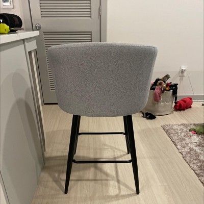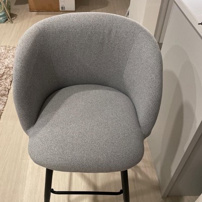 A: The stools are upholstered with padded fabric in a gray hue for a comfortable seating experience.
