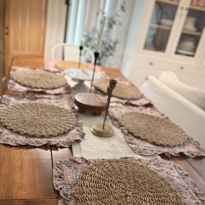 These are not hand blocked but rather reprinted in mass of a once hand blocked print. The fabric is 100% cotton but feels stiff (treated?) and rough. I’m hoping that is remedied when washed. For a ruffle design I’ve seen these range around 3x the price PER item. these come as a set and are really well priced with the quality is on par with that imo. The coloring and design is lovely in person but again have realistic expectations for it and it’s a good piece to mix into your home.