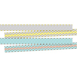 Barker Creek's Chevron Beautiful double-sided border has coordinating designs printed on both sides. This double sided trim features an on-trend chevron and dot design with lovely pastel colors. This set includes 24 strips of trim measuring 35" long 3" wide -- that's 70 feet of 'WOW' per package! These durable borders are printed on thick, coated paper. Border your bulletin boards, frame your doors, accent displays and special projects, decorate your office cubicle, jazz up your children’s rooms at home…the possibilities are endless!
