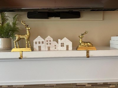 Bring a refined touch to your holiday decor with this 2-Pack Christmas Deer Stocking Holder Set from Wondershop™. This set includes two stocking holders — one in standing position and another in sitting a position — creating an inviting ambiance. Made of resin, these stocking holders are designed in gold-tone hue for a luxurious charm. The deer rest on a rectangular base with hooks to display your favorite stockings on Christmas Eve.