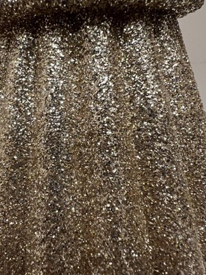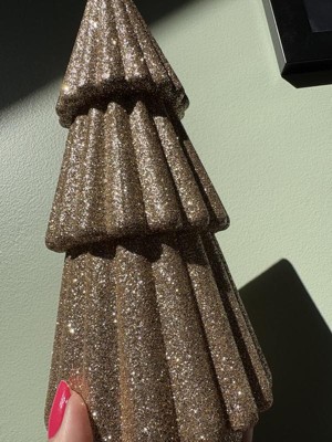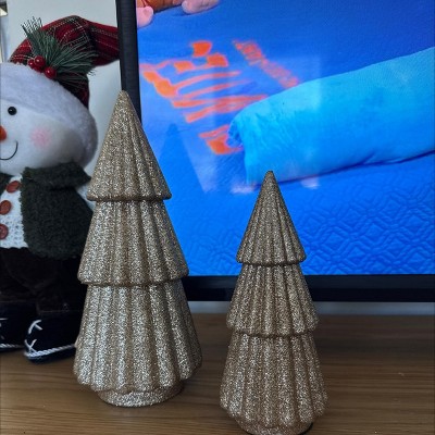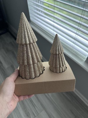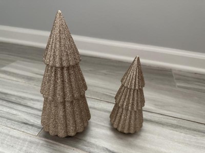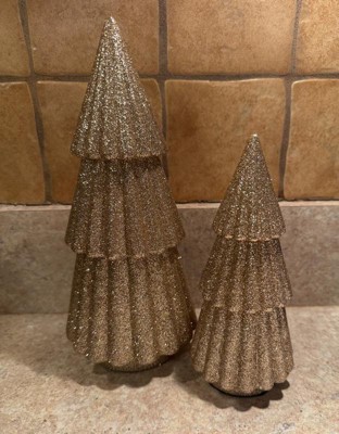 Bring festive shine to your seasonal decor with these 2-Pack Christmas Glittered Trees from Wondershop™. Made from plastic, the set includes two ribbed trees in different heights with three-tiered cone silhouettes in glittery gold for a stunning look. Display them on the mantel or console table or as a centerpiece on your dining table to instantly brighten your space with festive shimmer.
