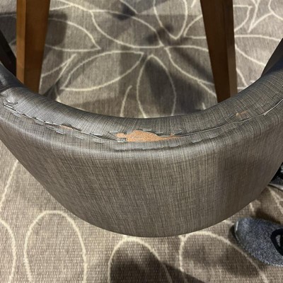 With the detailing of curved backrest and wide seat cushions, the Montreal Mid-Century Dining Chairs are ideal for your dining room's quick and elegant makeover. This set of two dining chairs feature upholstered seat and back cushions. The smooth gray faux leather upholstery is easy to maintain while providing you with a pleasant dining atmosphere. The chairs are supported by dark walnut finished solid wood legs, immediately transforming your dining room into a modern dining setting. Dimensions: 31.75" High x 19.50" Wide x 21.38" Long; Seating Dimensions: 18.50" High (from Floor) x 17.50"- 19.25" Wide x 18.50" Long
