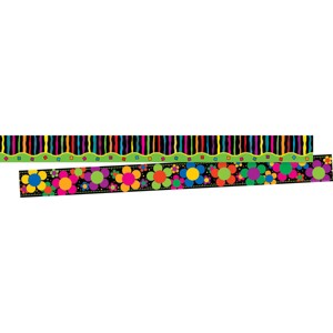 Barker Creek's Neon Double-Sided trim is as stylish as can be! Each package of trim includes 24 strips of trim measuring 3" high by 35" long — that’s 70 feet of 'WOW' per package! Bright colors and fun designs against a dark contrasting background makes all these Neon Borders really "POP!" in your classroom. These will be a bold addition to any room! These durable, bright borders are printed on thick, coated paper. Use Barker Creek's borders to brighten bulletin boards, frame doorways, define learning centers, and celebrate special events!