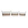 Use as a chic standalone piece to house a plant, or as a set of 3 to organize books and throws. This item ships in 1 carton. Due to the handmade nature of these, there will be slight color, shape, and size variations, as well as loose fibers. Suitable for indoor use only. This item ships fully assembled in one piece. Maximum weight limit is 5 lbs. Made in Indonesia. This white colored basket organizer comes as a set of 3. Coastal style.