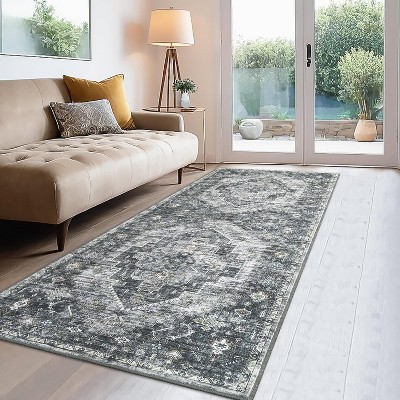 2x6Ft Vintage Area Rug - Machine Washable Non Slip Low Pile Boho Distressed Carpet with Border for Living Room Bedroom Kitchen, Gray