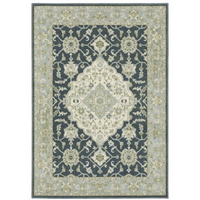 The Bryant collection is power-loomed in the US of tri-colored and textured polypropylene yarn. It features a range of designs from traditional Persian to soft modern in beautifully updated, yet classic colors of deep navy, cool soft blue, moss green, garnet red and neutrals with a bit of shine, hinting at shades of metallic gold and silver. The multi-colored yarns add depth and visual interest to the designs and the textured effect creates a very soft hand.