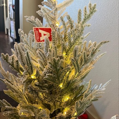 Liven up your holiday decor with this Christmas Pre-Lit Potted Flocked Glittered Tree from Wondershop™. This artificial Christmas tree features faux flocked Norfolk branches for a realistic look and wintry charm, while white LED bulbs with constant lighting add festive ambiance. Plus, this faux Christmas tree is housed in a round white pot for easy placement on your floor or tabletop.