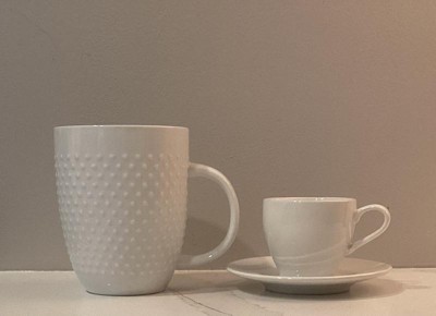 - Rimmed saucer design and curved cup handle create a comfortable grip