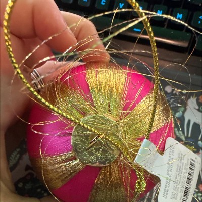 This 3.5-Inch Christmas Thread Wrapping Ornament from Wondershop™ adds a striking touch to your tree. This stunning ball ornament is covered with thread-wrapped sections in hot pink alternating with gleaming gold glitter, creating eye-catching contrast and infusing your decor with celebratory vibes. Intended for indoor decorative use, the ornament also features a gold-tone cap with a coordinating top loop for easy hanging on the branches of your tree.