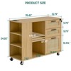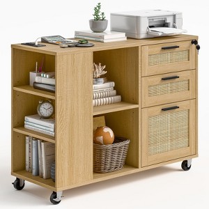 This mobile file cabinet makes charging easy with 2 outlets, 2 USB ports, and a 4.9-ft power cord—perfect for powering printers, scanners, lamps, phones, pads, and laptops while working or studying. It offers secure, stylish storage: 3 lockable rattan-decorated drawers (1 key locks all, plus 1 file drawer with adjustable suspension bars for letters/A4 files) and extra shelving. Two front open shelves and three side open shelves are flexible—install horizontally or tilted, and adjust height for items of different sizes. With 1 large desktop, 2 pencil drawers, 1 file drawer, and 5 adjustable shelves total, it meets most office storage needs. Rolling on 4 wheels (2 lockable, 2 360° swivel), it moves or stays fixed freely; high-quality materials and a sturdy design ensure durability.