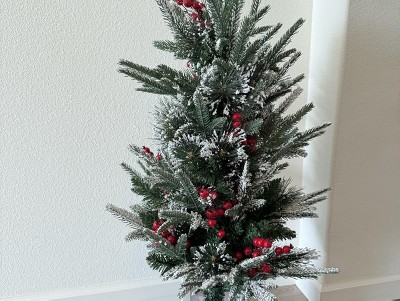 It includes an elegantly designed pot base with built-in lights, enhancing your holiday decor. The green branches are beautifully decorated with snowflakes and faux red berries, giving it a realistic and festive look.
