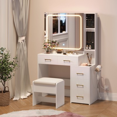 3-in-1 Vanity Desk with Lighted Flip-Top Mirror & Adjustable Cabinet, Makeup Dressing Table with Stool, Dresser with Drawers for Bedroom