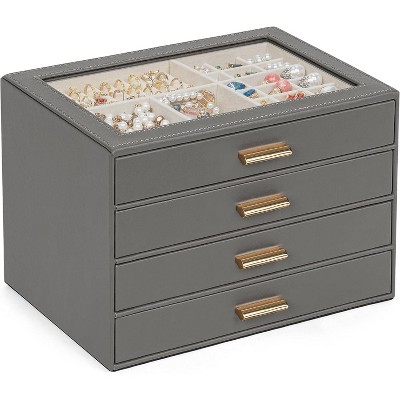 - Stylish & Functional Display: Features a sophisticated 3-layer pull-out design with a clear glass top lid, beautifully showcasing your favorite jewelry collection while keeping it organized and dust-free; perfect for storing earrings, rings, bracelets, watches, and necklaces.Stylish & Functional Display: Features a sophisticated 3-layer pull-out design with a clear glass top lid, beautifully showcasing your favorite jewelry collection while keeping it organized and dust-free; perfect for storing earrings, rings, bracelets, watches, and necklaces.