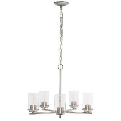 The smooth metal brushed nickel finish with a matching canopy and simple clear glass shades on this three-light 17" pendant come together and create a traditional design with a modern update. Add brightness and charm to your entryway, stairwell, dining room, bedroom, office or living room with this elegant chandelier pendant fixture! Item is also available in a number of different finish options.