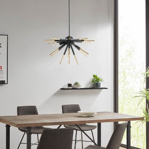 Bold and modern, the INK+IVY Ely 3-Light Spiked Chandelier brings an eye-catching addition to your home. Flaunting a two tone matte black and gold finish, this chandelier has a unique modern geometric design, for an artistic look. Also included are 4 extension rods, 3 measuring 12in and 1 measuring 6in, which allow the light fixture to be mounted either 2 different semi-flush ways to the ceiling or 5 different ways as a hanging chandelier. The rods adjust between 6in - 42in to bring the maximum hanging height to 53in for the perfect fit in your dining room, kitchen, entryway, or living room. For indoor use only, this modern farmhouse style chandelier is not compatible with a slope ceiling and must be hardwired to the ceiling. Professional installation is recommended and mounting hardware is included. Dimmable with compatible dimmer switch and bulb (not included). Uses 3 Type B light bulbs (not included).