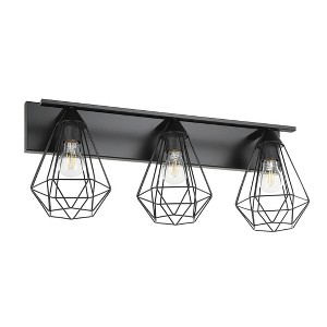 The Tarbes 3-Light Bath/Vanity Light by Eglo boasts an open geometric design with a Matte Black Finish and Open Frame Geometric Shades. Three 40W bulbs (not included) sit within to cast a warm glow over your space. Rated for Damp Locations Lovers of chic, vintage, and loft styles will be very happy: Lights designed with a used look. Experience a journey through time with lamps reminiscent of the 1920s to the 1980s. Indulge in nostalgia and give your home a vintage style.