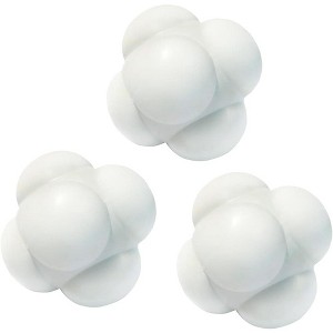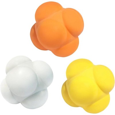 The reaction ball is made from rubber with high elasticity and durability and is 2.6" in diameter. When this six-sided high-bouncing ball lands on the ground, it takes an unpredictable hop/bounce, forcing the user to make quick decisions and directional movements to retrieve the ball. Thus, it creates hand-eye coordination, improves reflexes, and generates quick reactions for all sports play. It can be used on all hard surfaces, such as walls, grass, concrete, garage doors, etc.