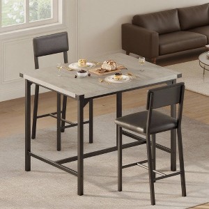 This industrial-style counter-height dining set features protective metal corner guards and a wood-grain finish, offering a spacious 35.4"x29.5" table (300 lb capacity) with space-saving stools (400 lb each) that tuck underneath; includes PU leather upholstery, ergonomic backrests, built-in footrests (15.6" seats), waterproof surfaces, and comes with labeled parts/tools for simple assembly.